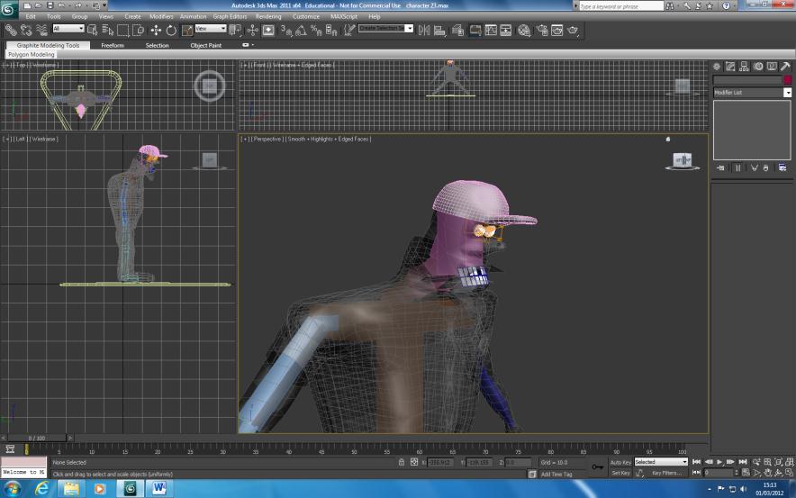 I decided to then go back and work on the mouth as it didn’t look quite right. I deleted all of the segments on the face around the mouth area and used the shift copy method to create a new blank one. I used the connect tool to break the bigger segment up into smaller ones so they can be more easily moved. I extruded the middle ones inwards a little and moved the outer ones around a little. I used the bend modifier on the teeth I created earlier so that the teeth became more rounded and fit comfortably in the slot in the mouth. I then moved the vertices around so that parts of the teeth were covered by the lip area and also so you can see some of the teeth when viewing the villain from the side.